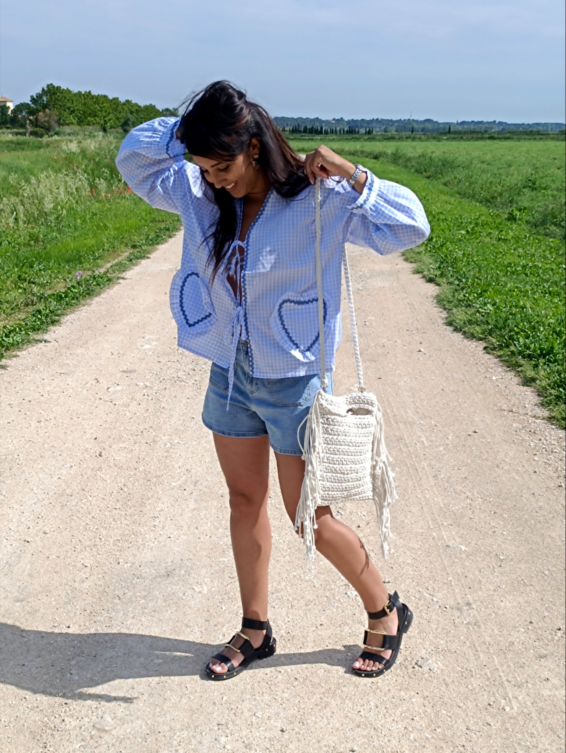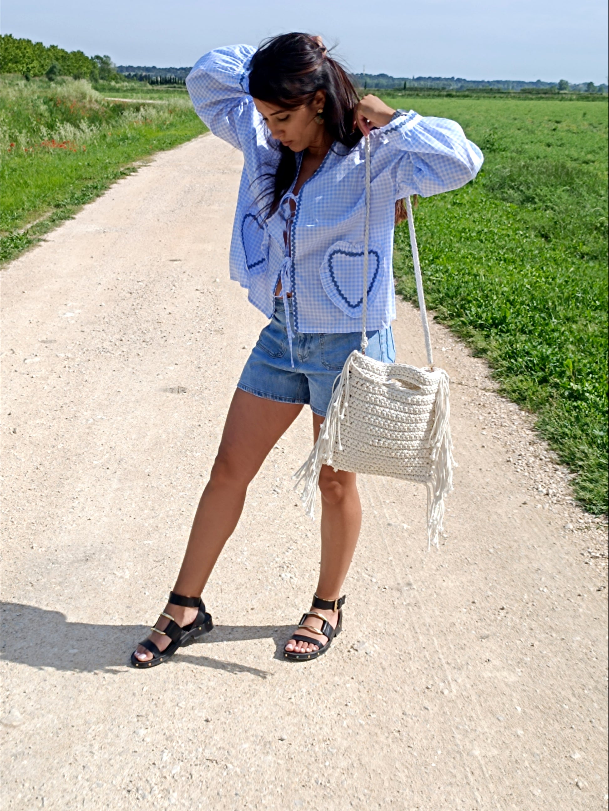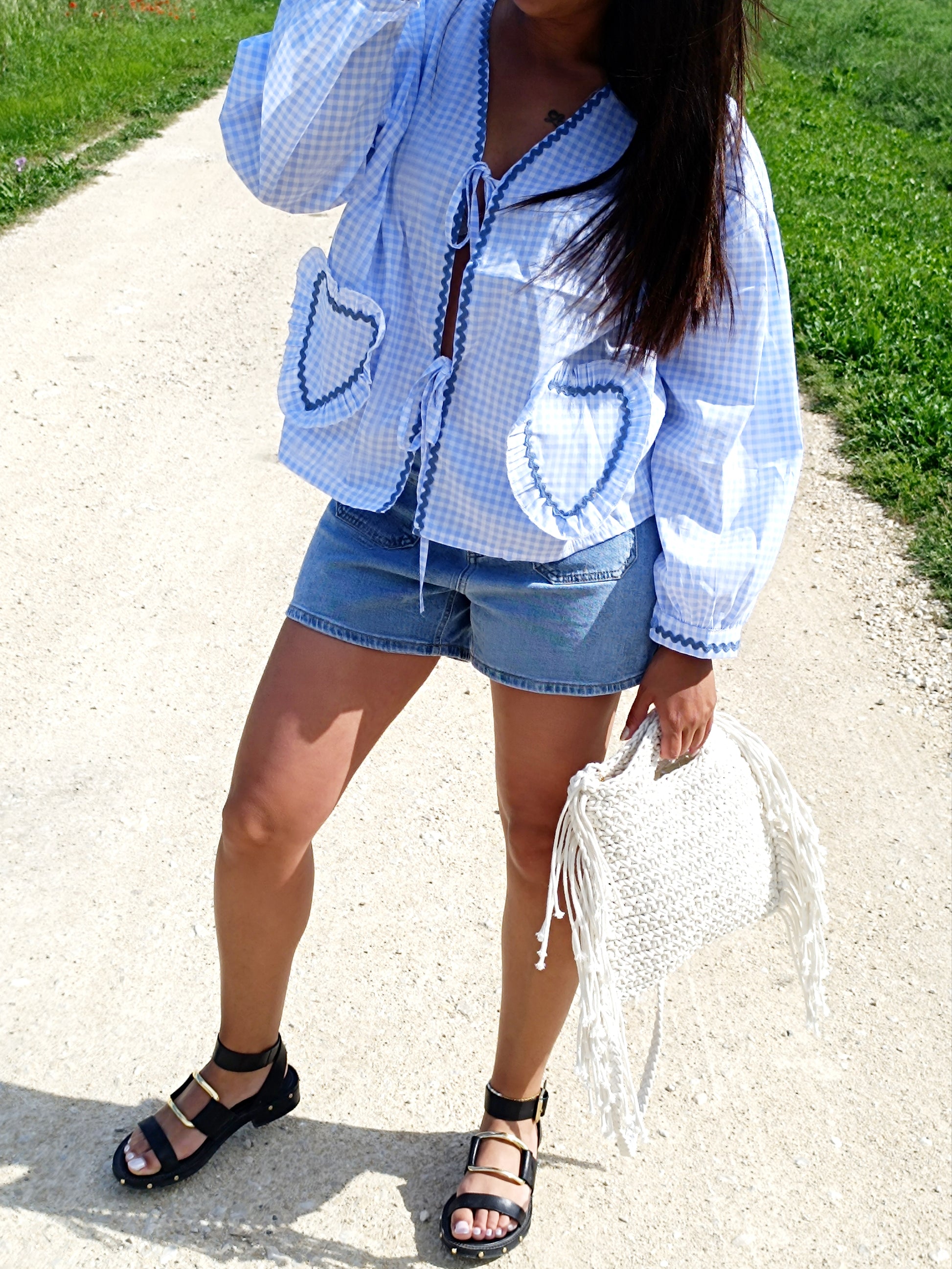- Coup de cœur pour cette blouse à motif vichy bleu clair avec les cœurs et la broderie sur l'avant bleu charrette