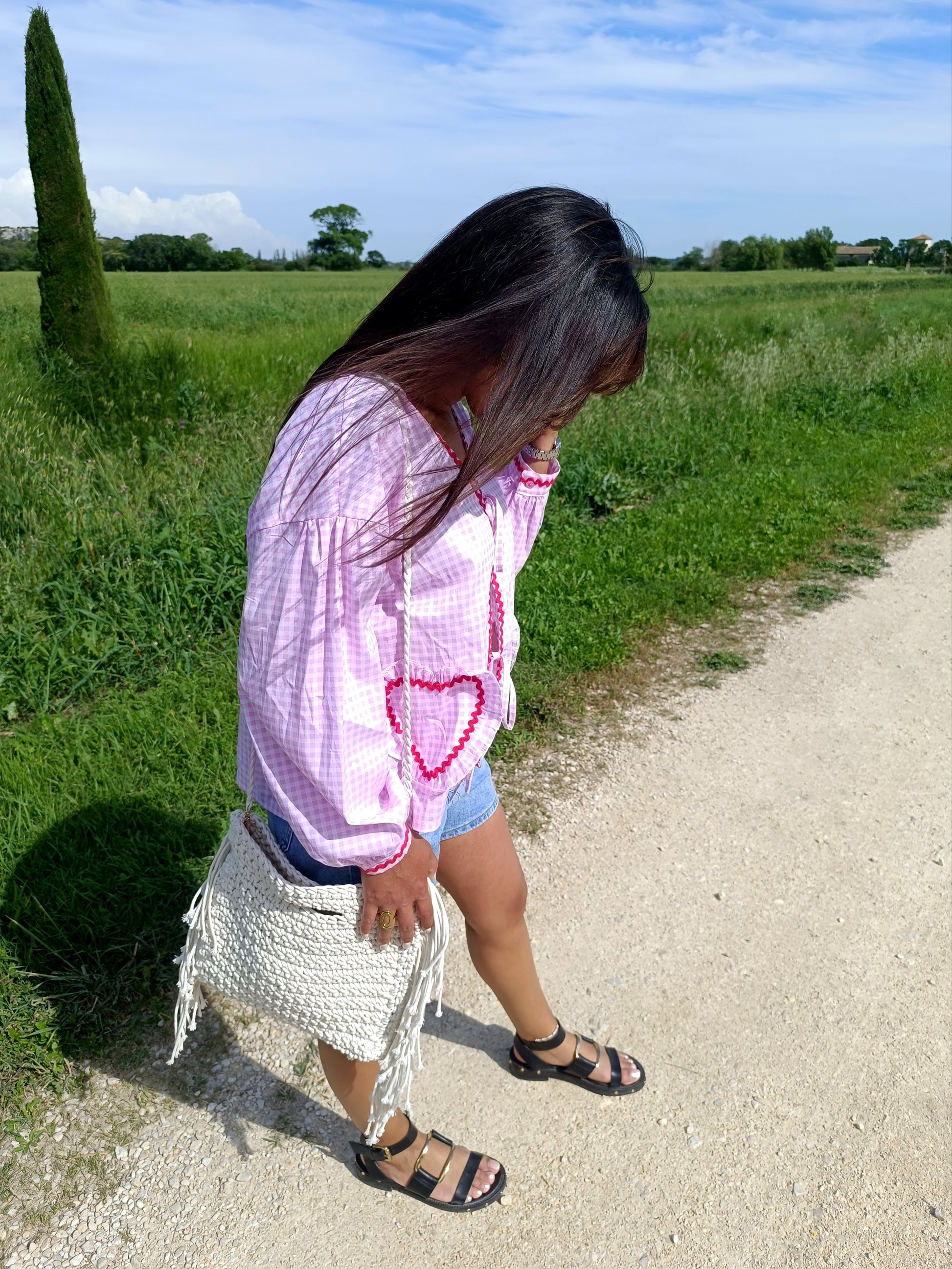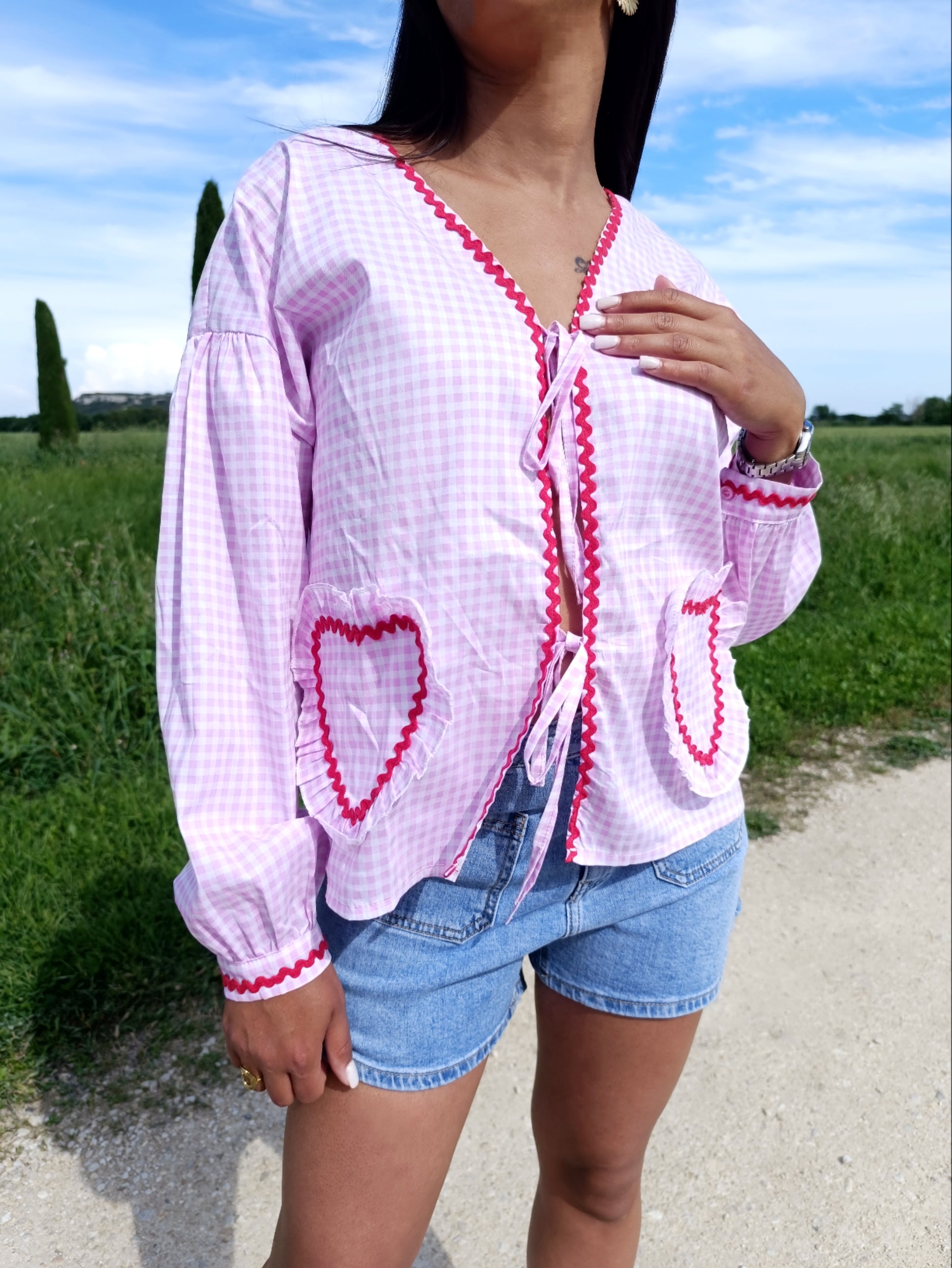 - Coup de cœur pour cette blouse à motif vichy rose avec les cœurs et la broderie sur l'avant rouges 💗