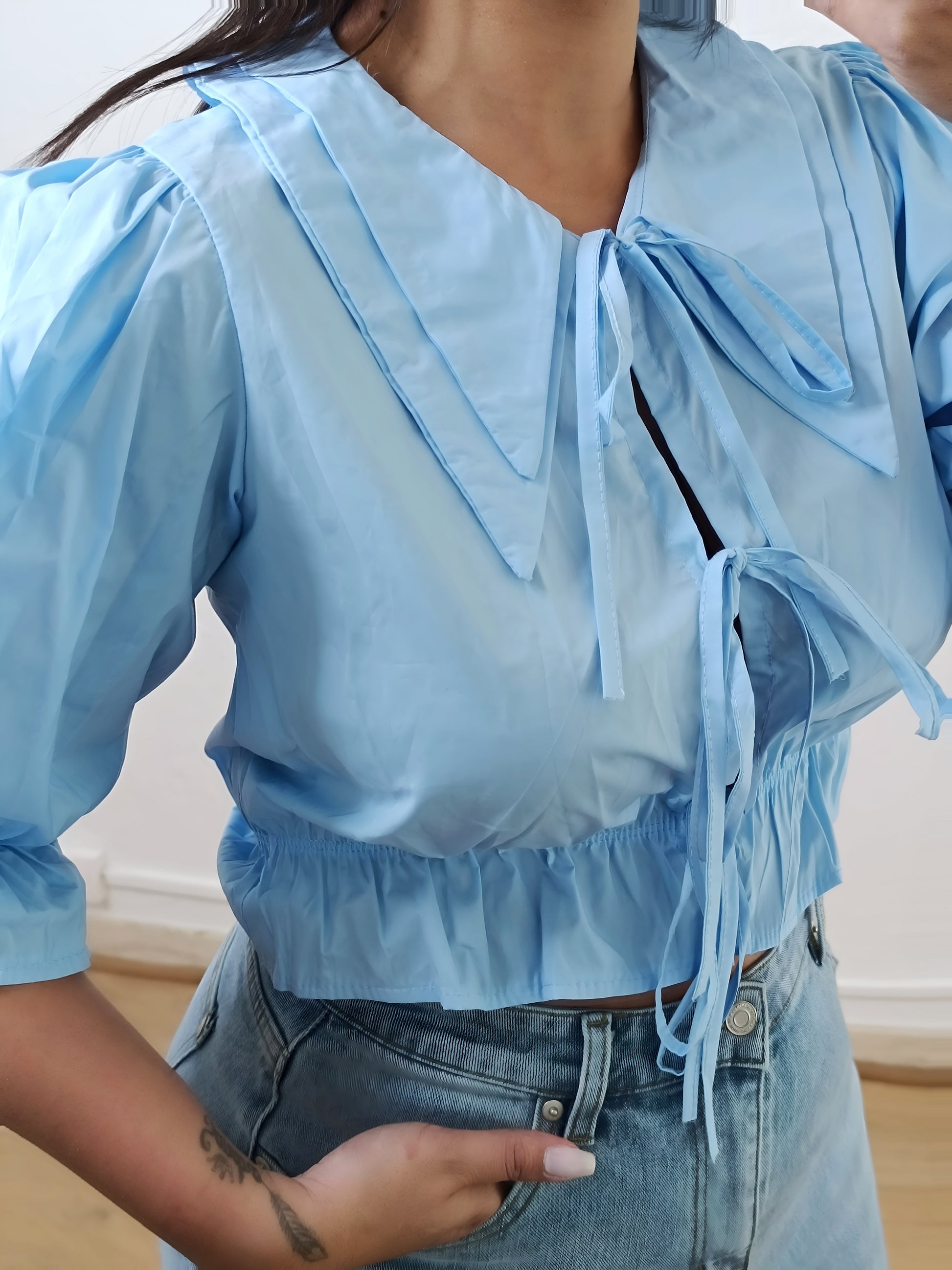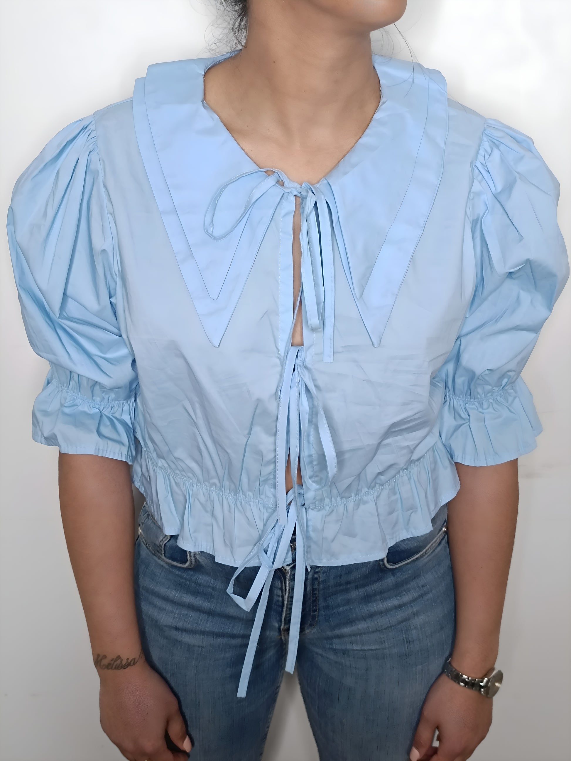 - La blouse est bleue avec des manches trois-quarts ballon