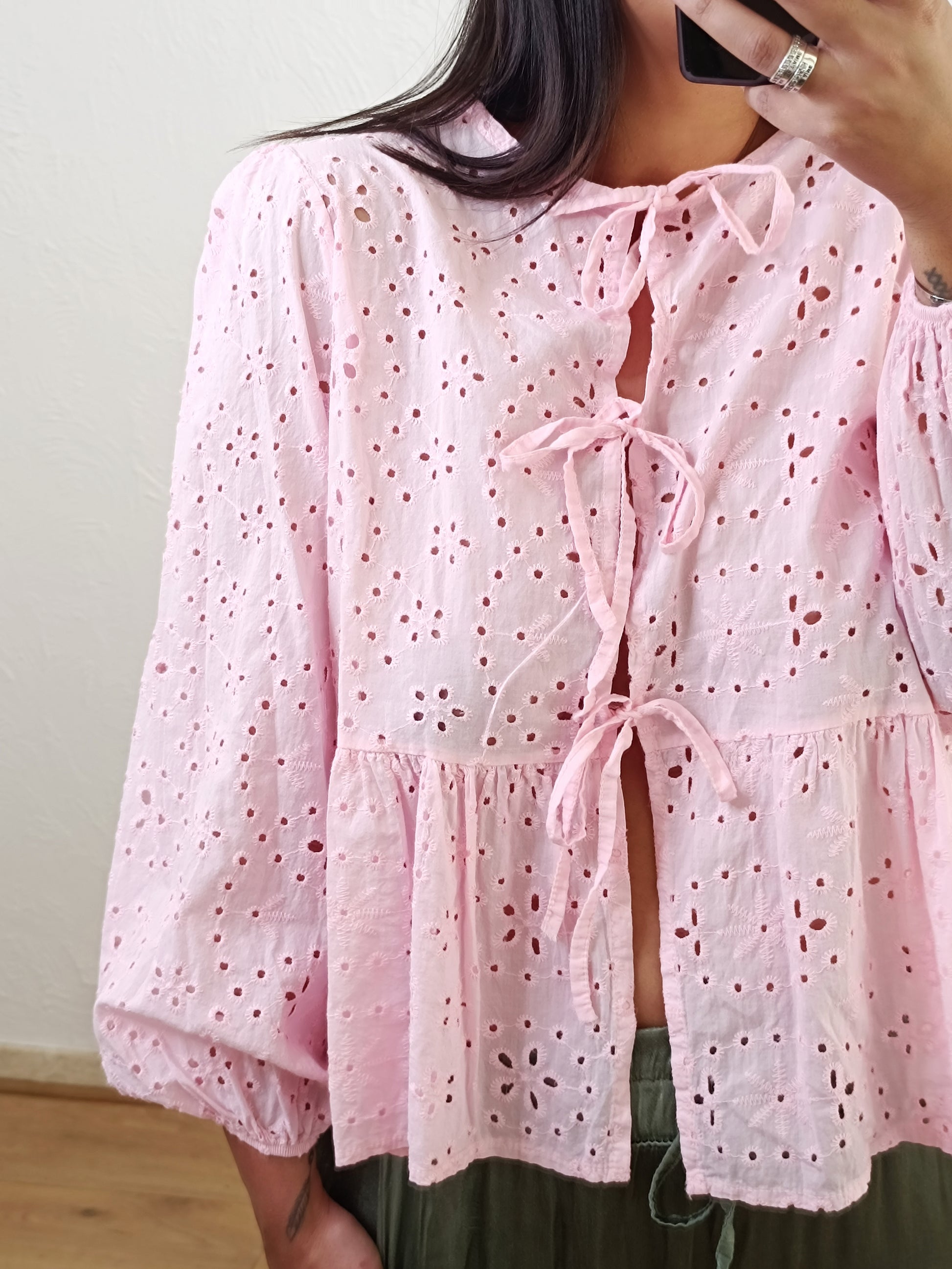 - On aime beaucoup la broderie anglaise ajourée sur l’intégralité de la chemise