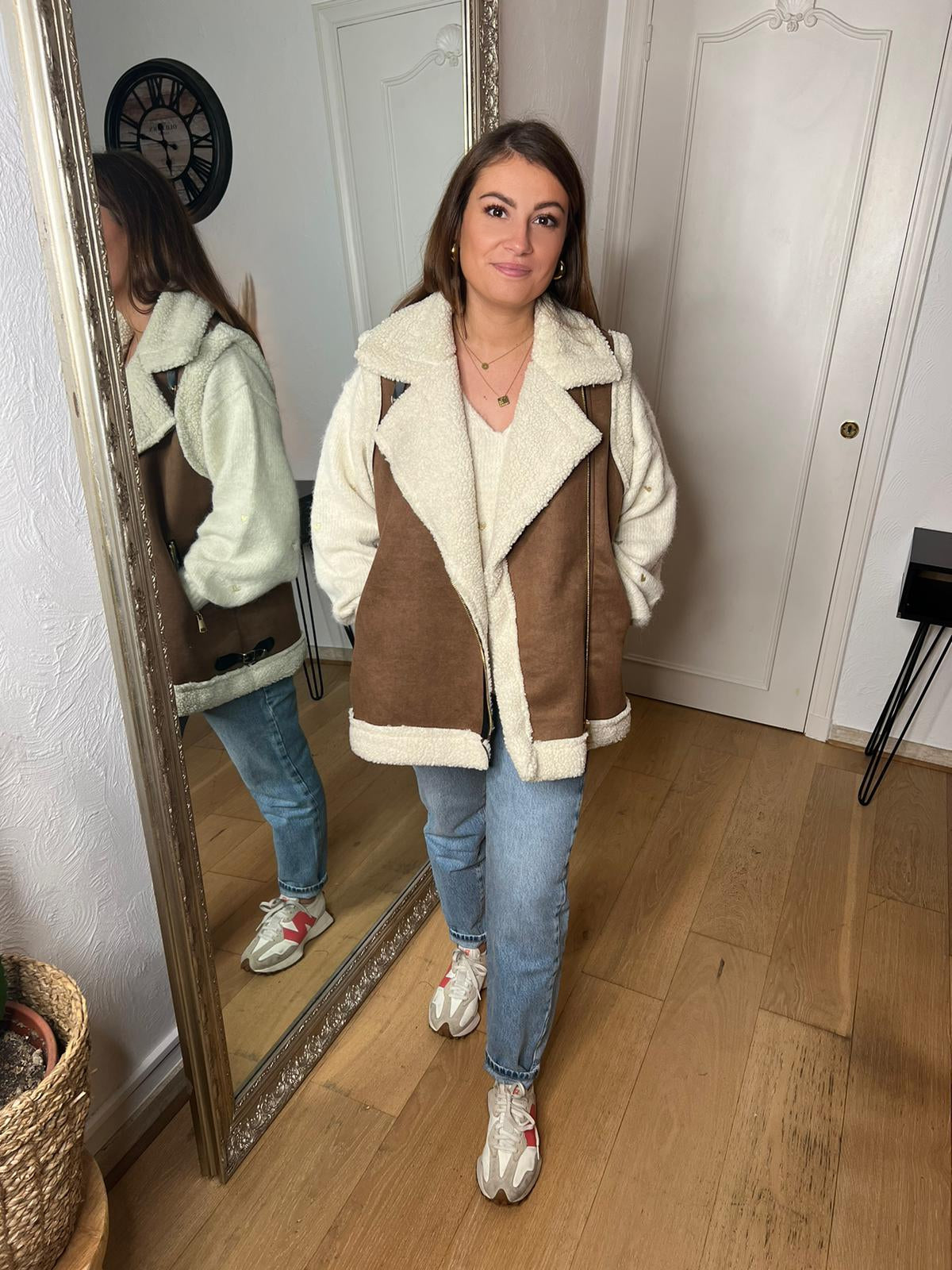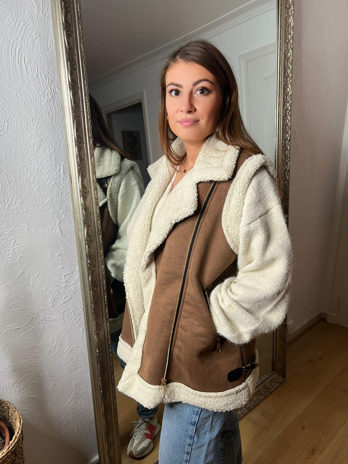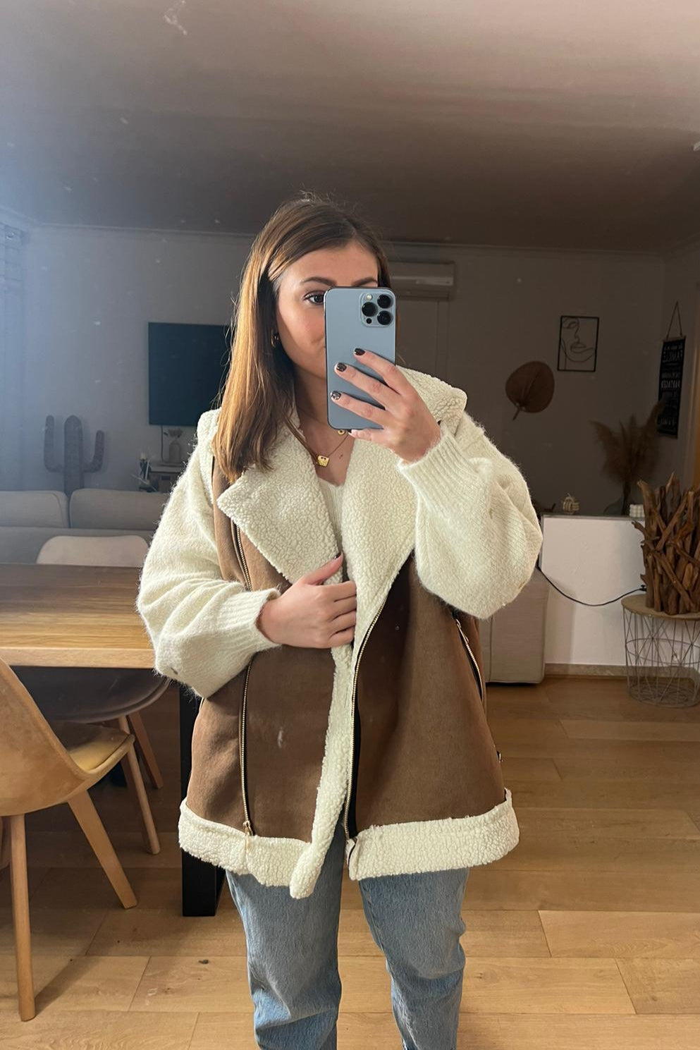 - On adore sa matière effet daim camel avec empiècements teddy et similicuir noir