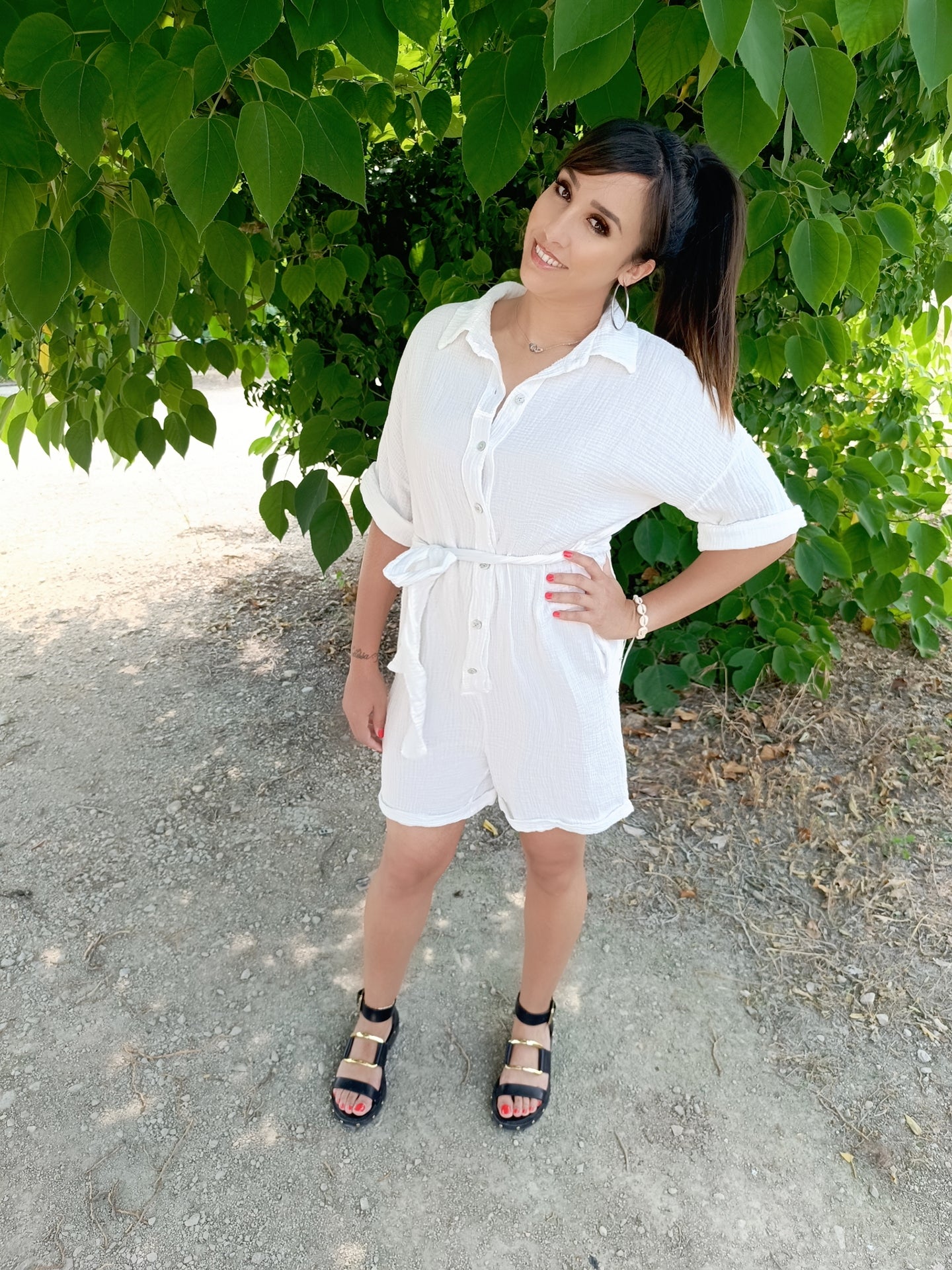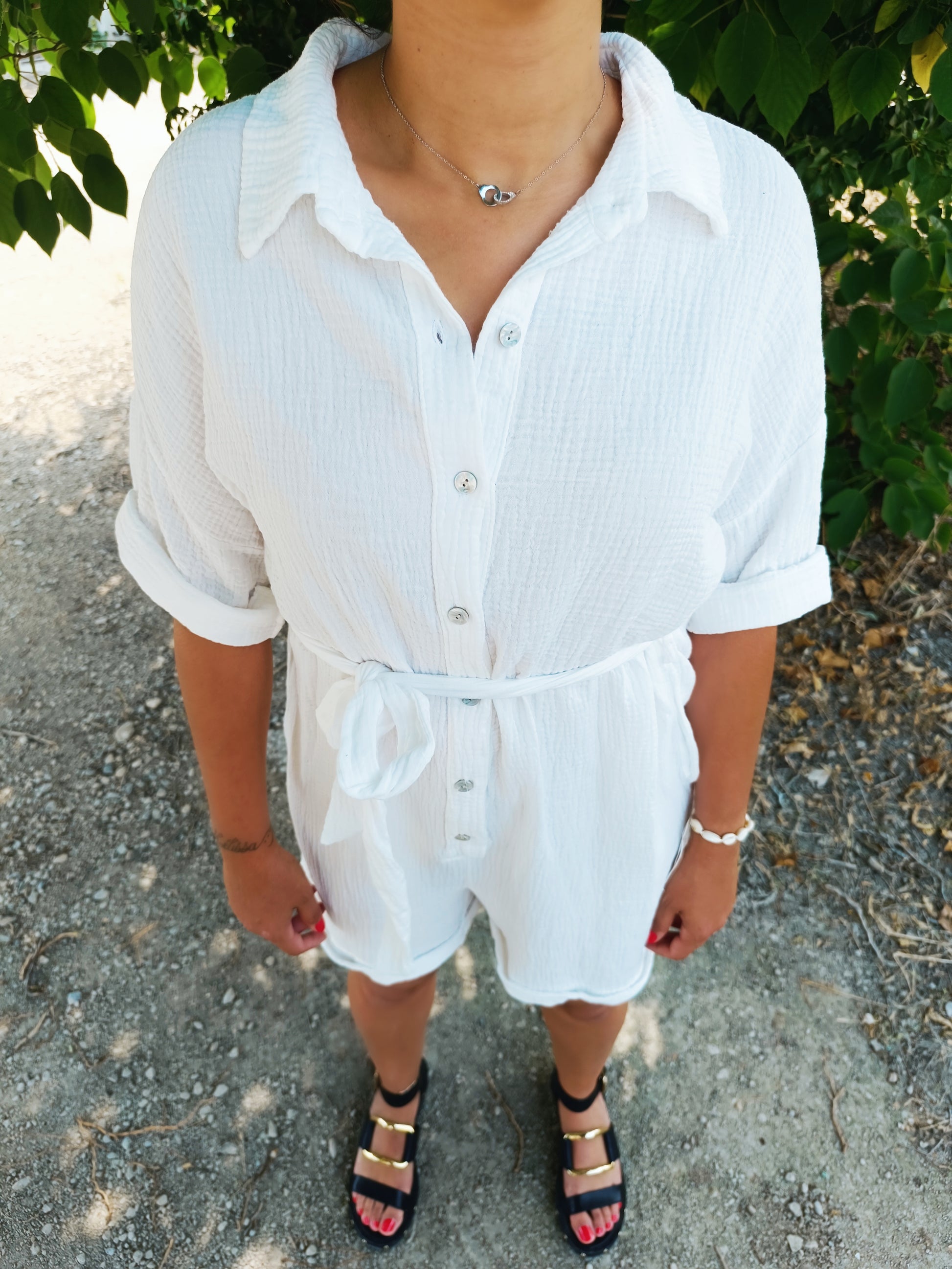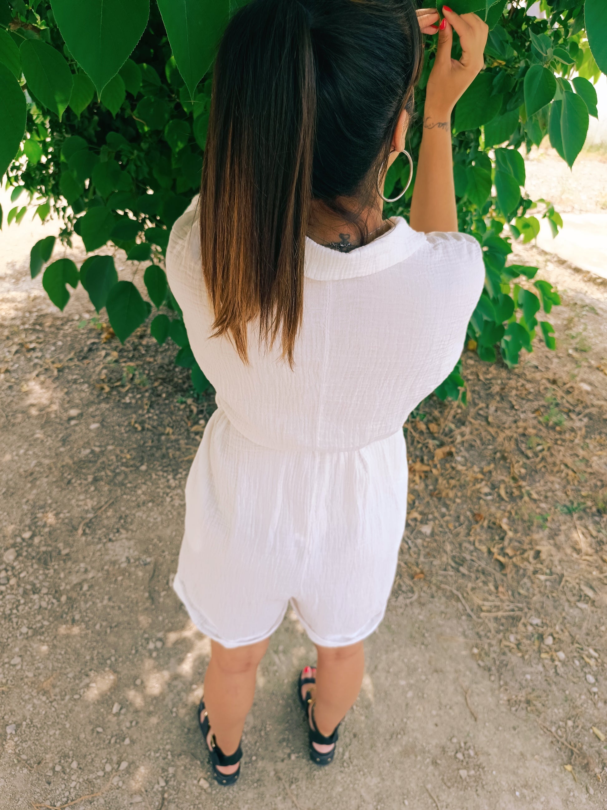- Combi short coupe chemise avec petits boutons de fermeture nacrés sur l’avant