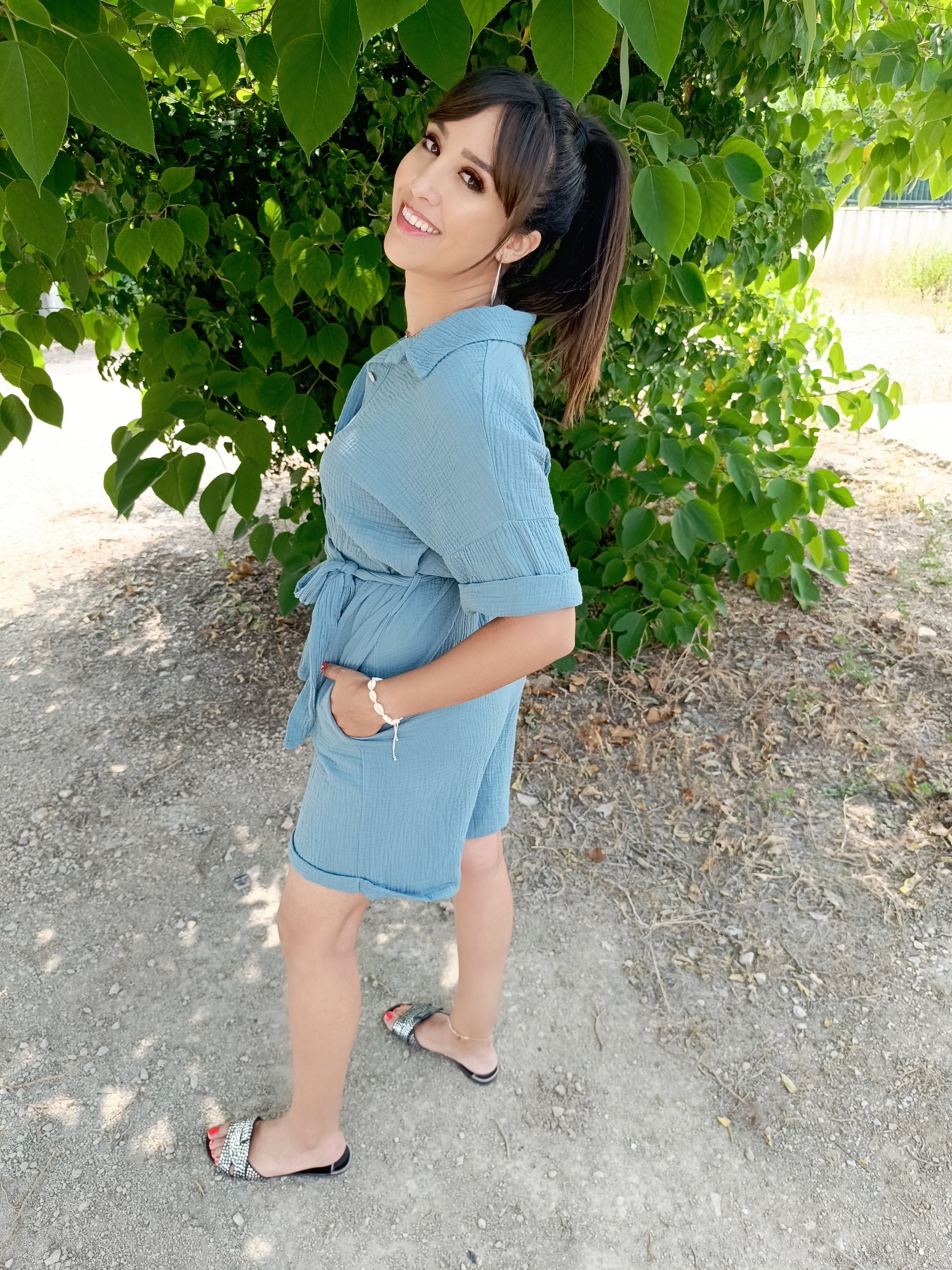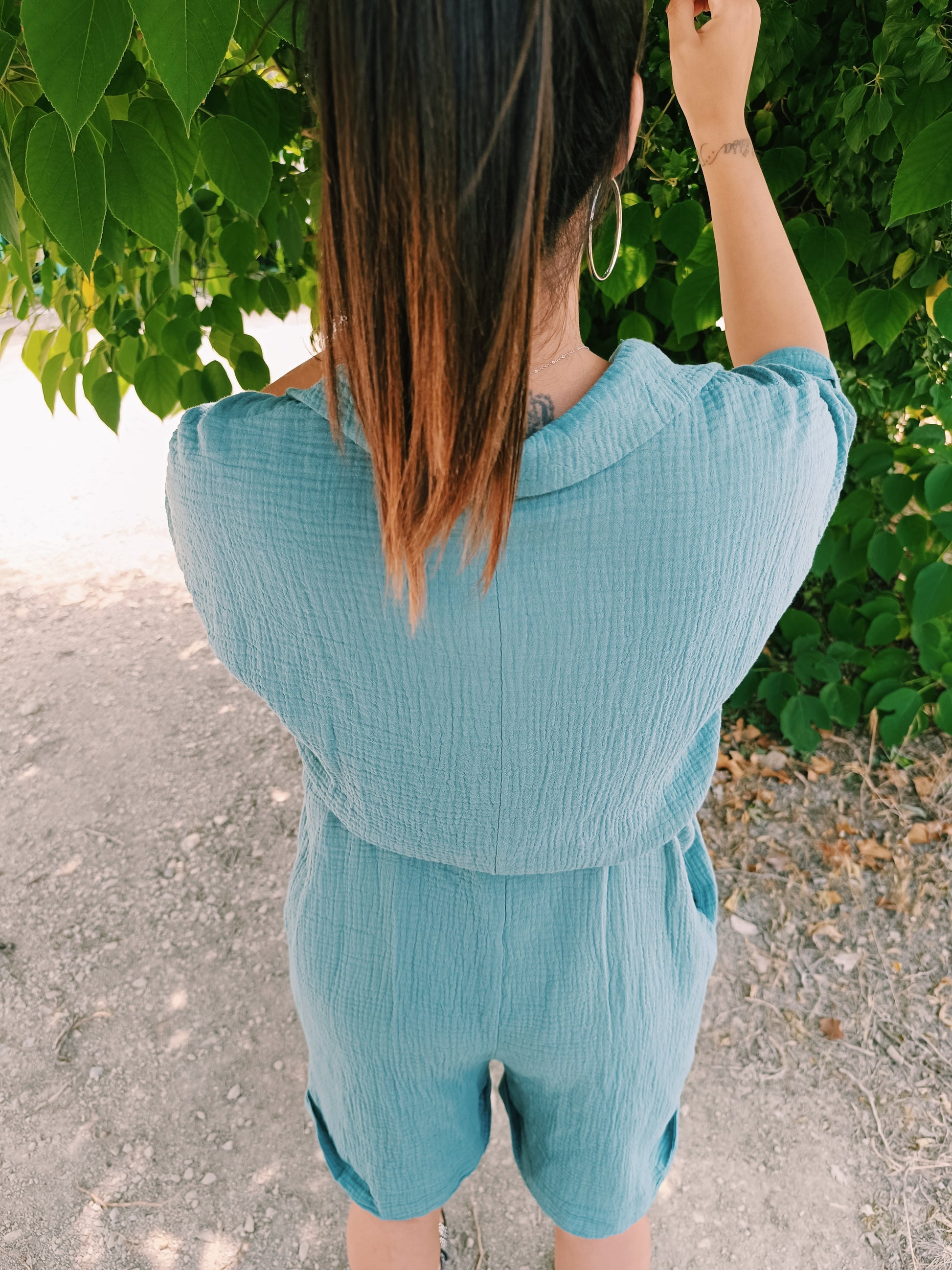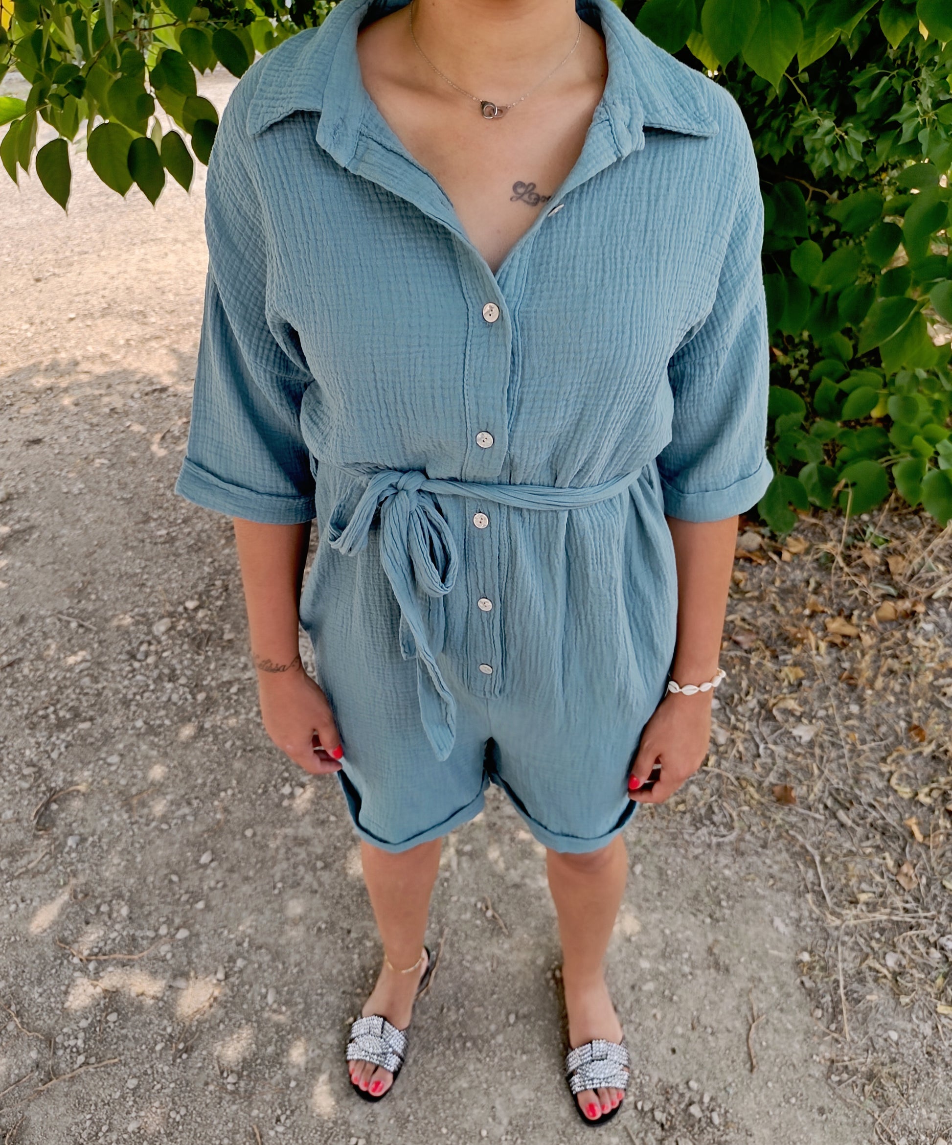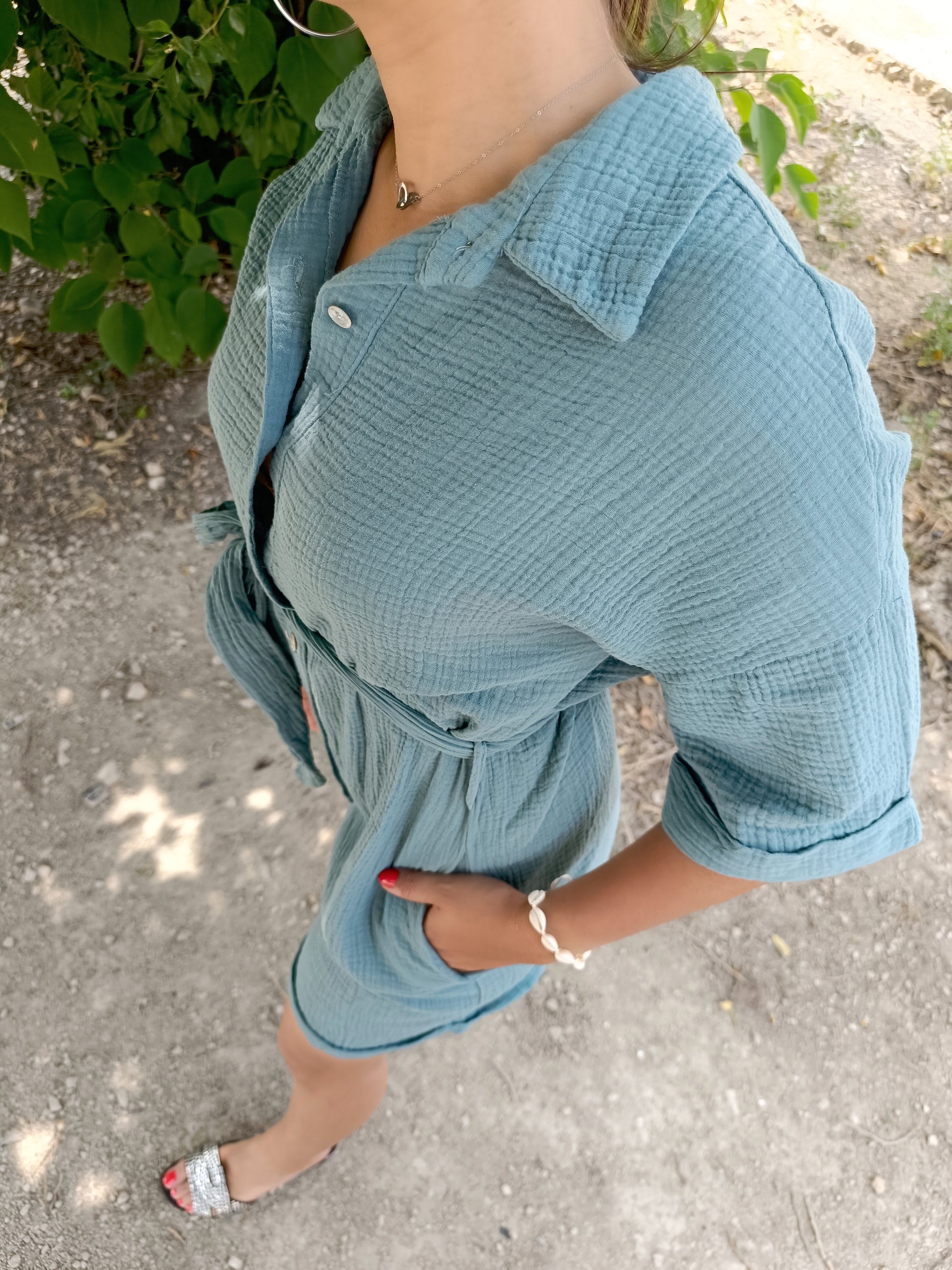 - Combi short coupe chemise avec petits boutons de fermeture nacrés sur l’avant