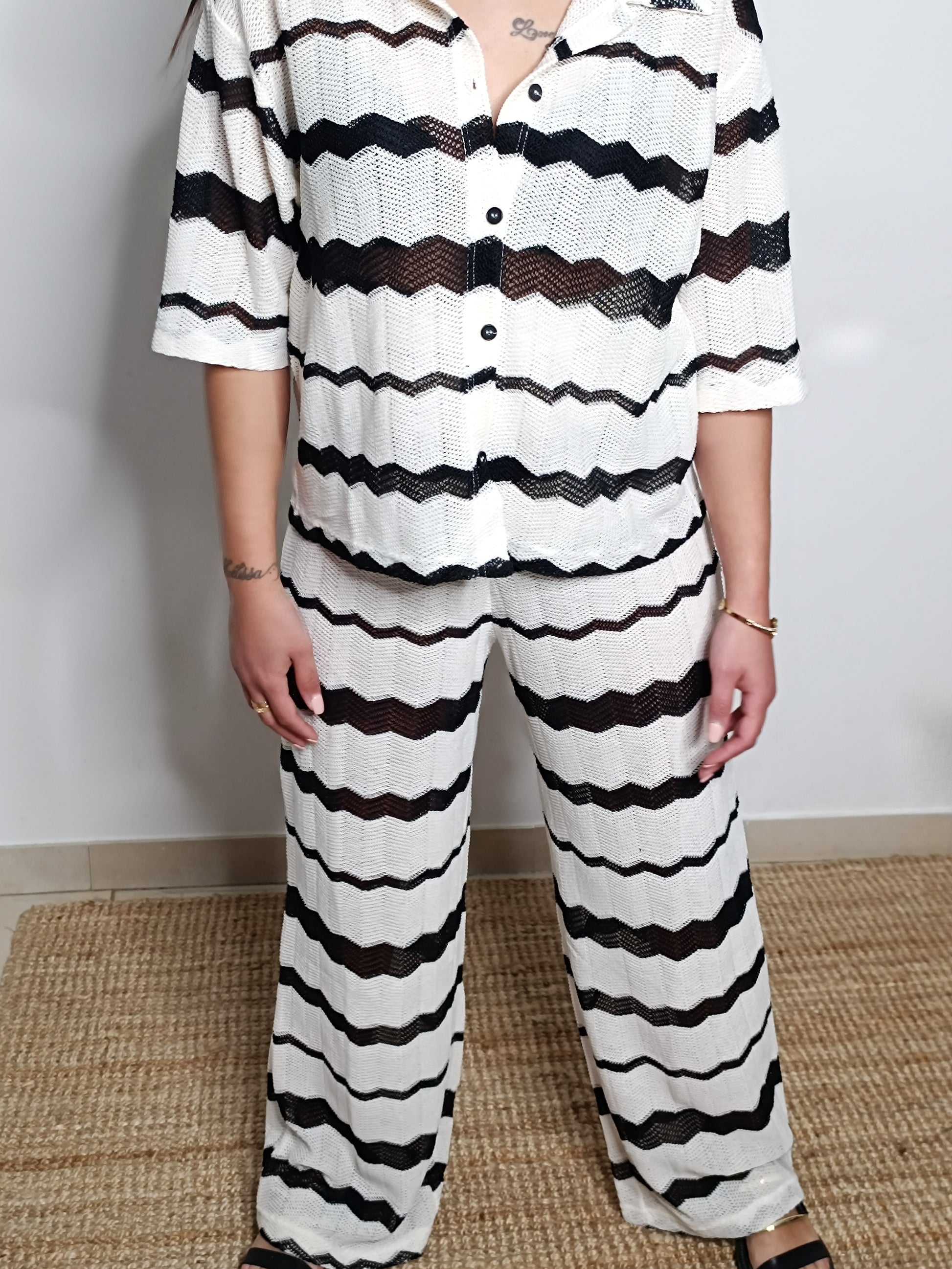 - Le pantalon est fluide et dispose d'un élastique à la taille, il est évasé sur le bas