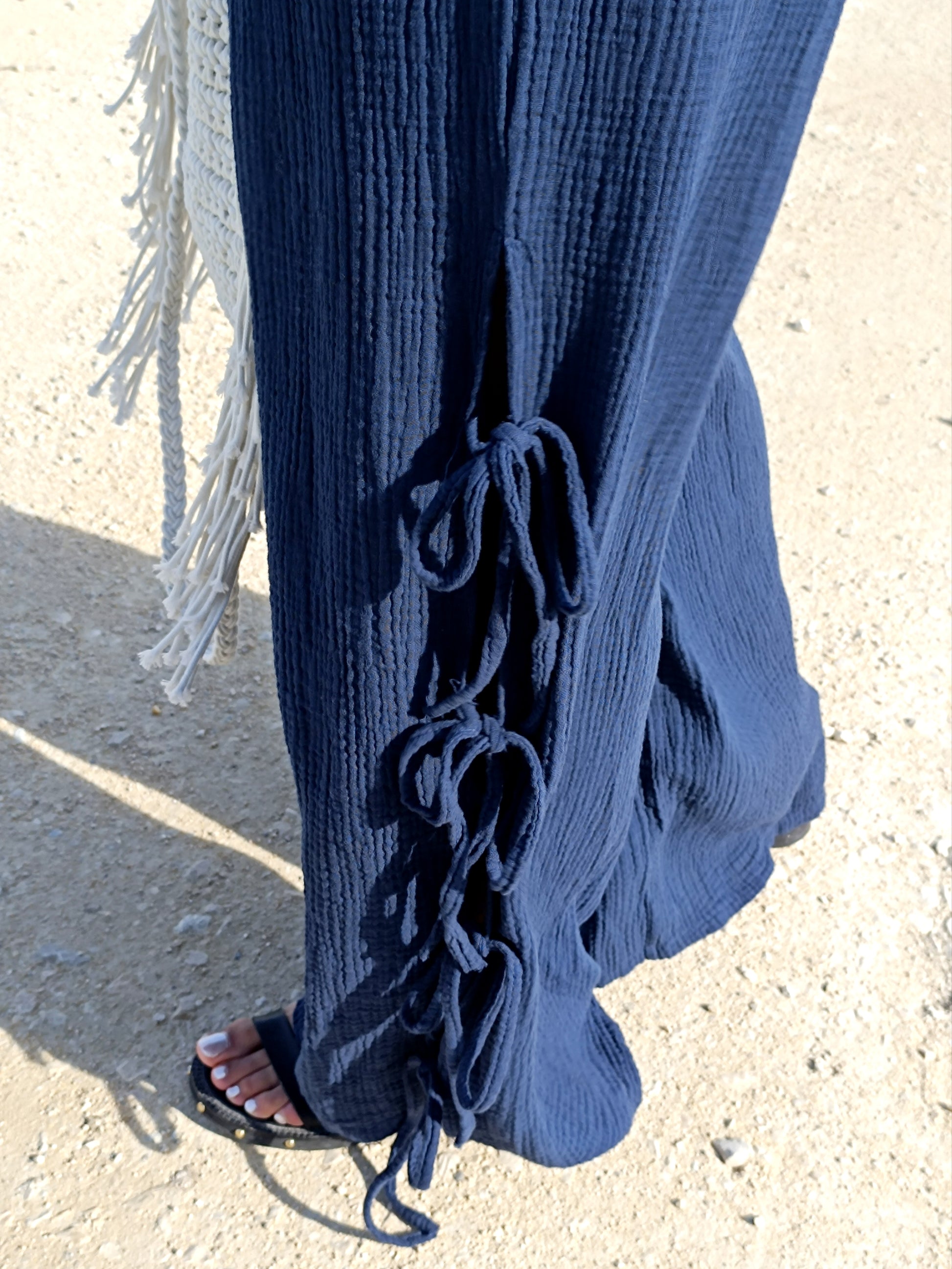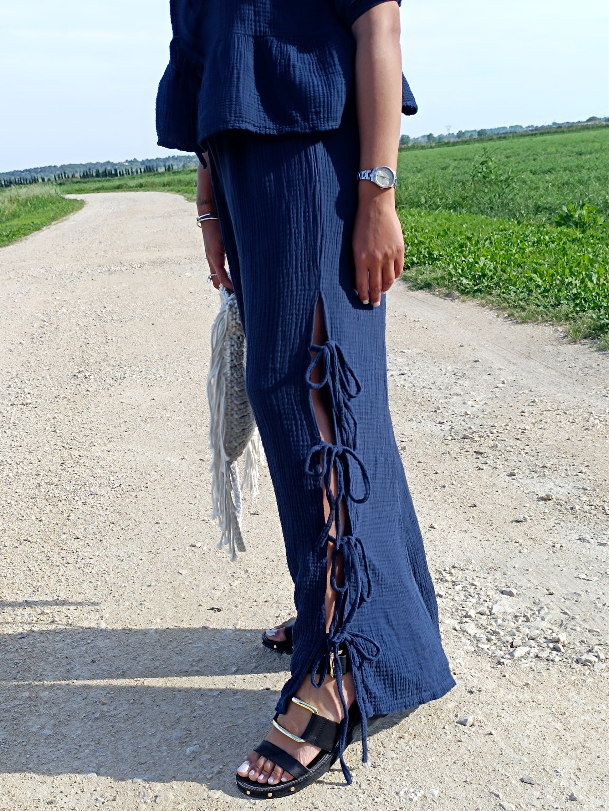 - Le pantalon est ajouré sur les cotés avec quatre petits nœuds, élastique à la taille
