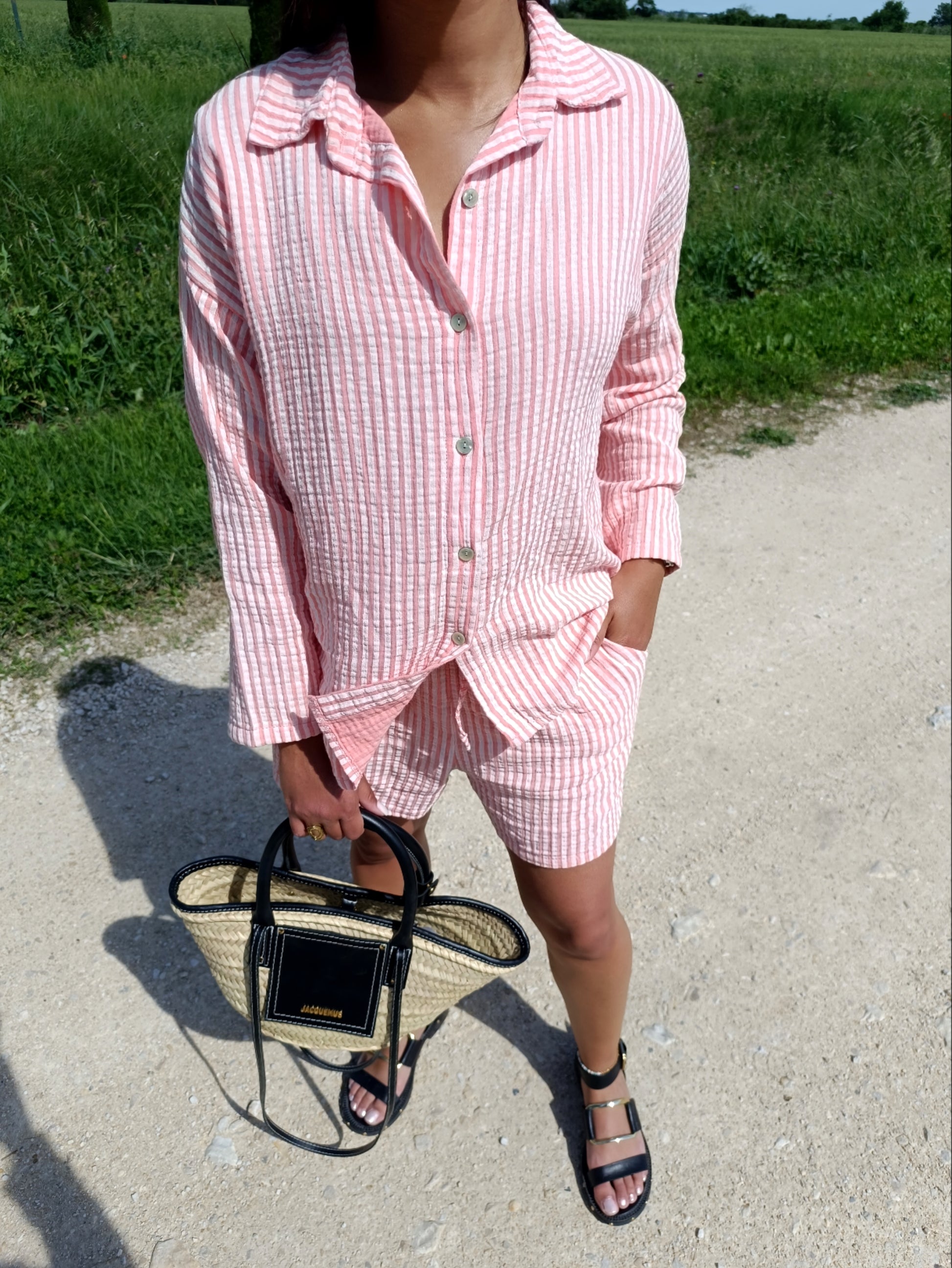 - Ensemble en gaze de coton rayé écru et blanc