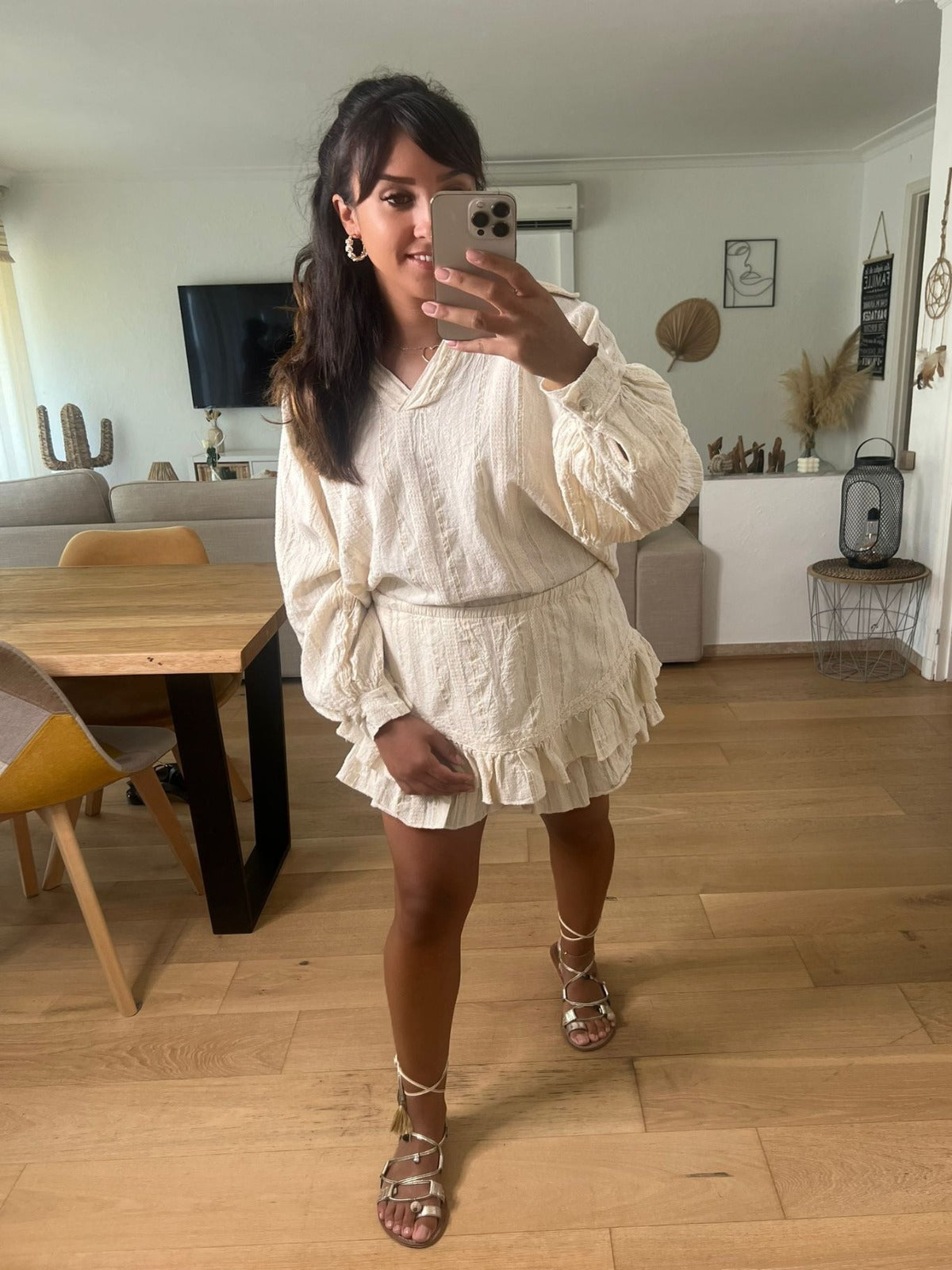 - Notre coup de cœur de la collection : cet ensemble composé d’une blouse et d’un short en gaze de coton beiges