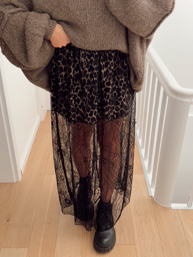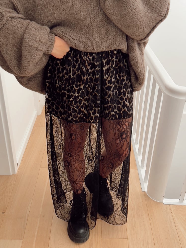 - Cette jupe longue en dentelle noire est la combinaison parfaite de romantisme et de modernité. Sa doublure léopard apporte juste ce qu'il faut de couvrance tout en laissant deviner la transparence de la dentelle, pour un effet à la fois chic et sensuel. Une pièce incontournable pour une toute élégante.
