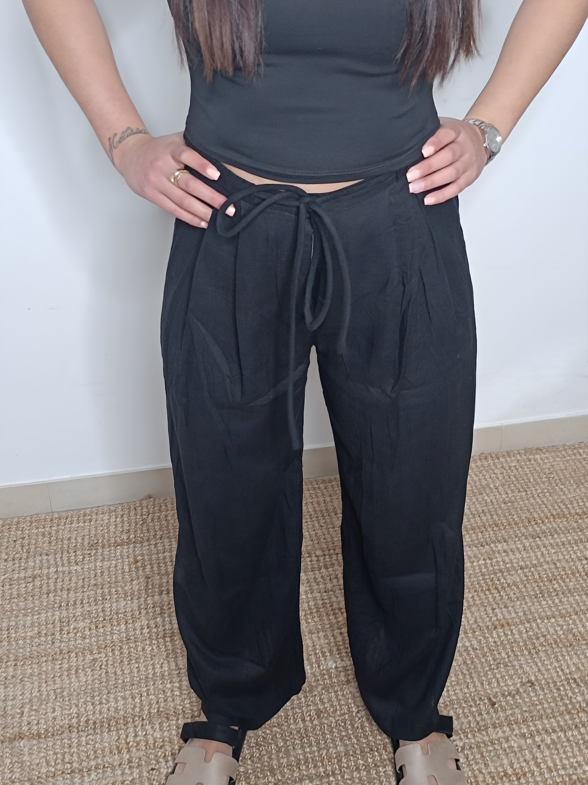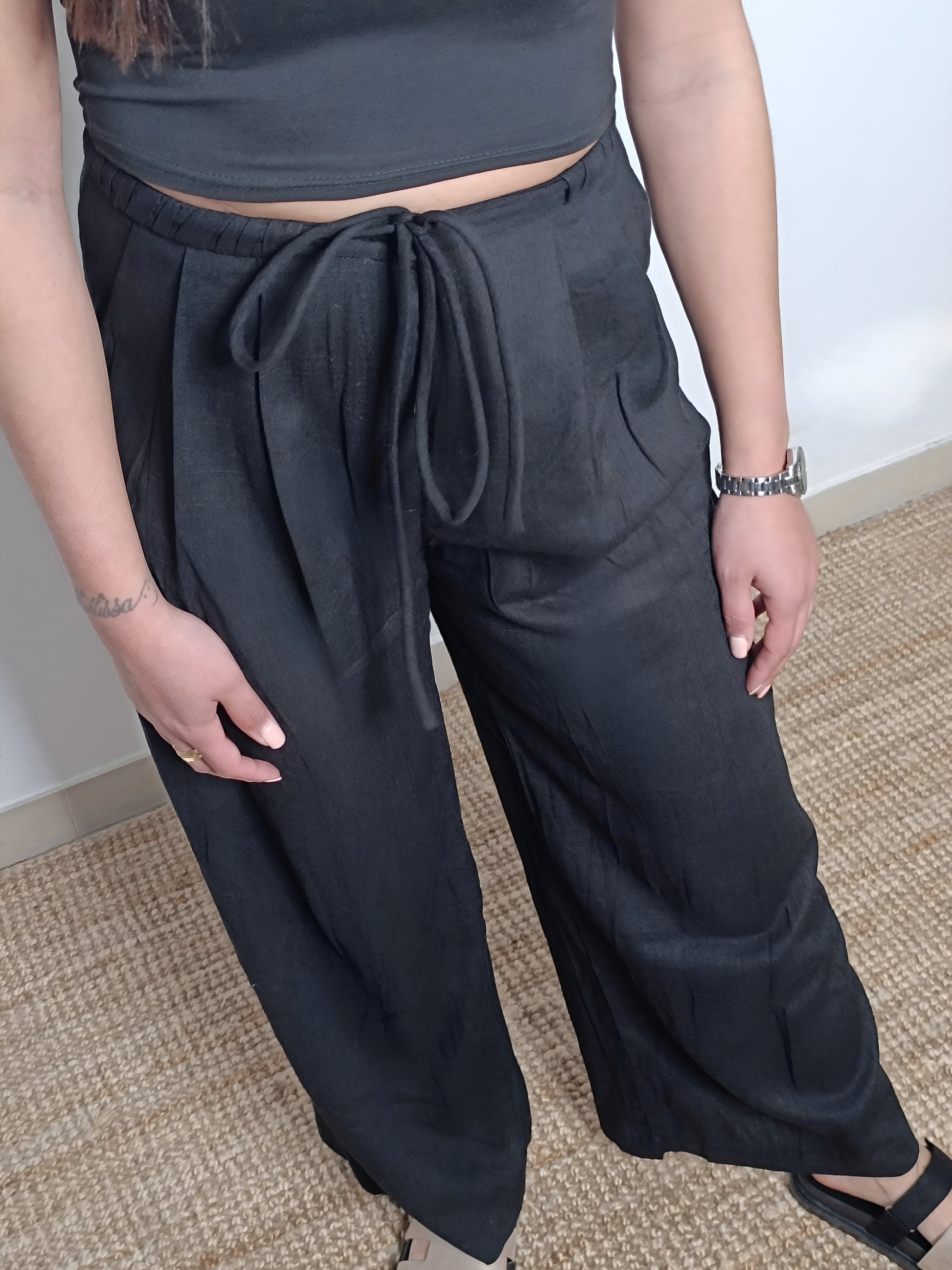 - Pantalon noir fluide évasé avec bouton de fermeture au niveau de la taille et lien de serrage