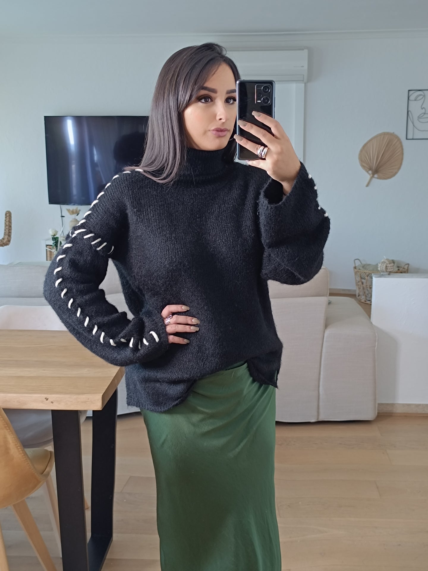 - Pull assez long qui a une coupe légèrement oversize, des emmanchures basses et un col roulé