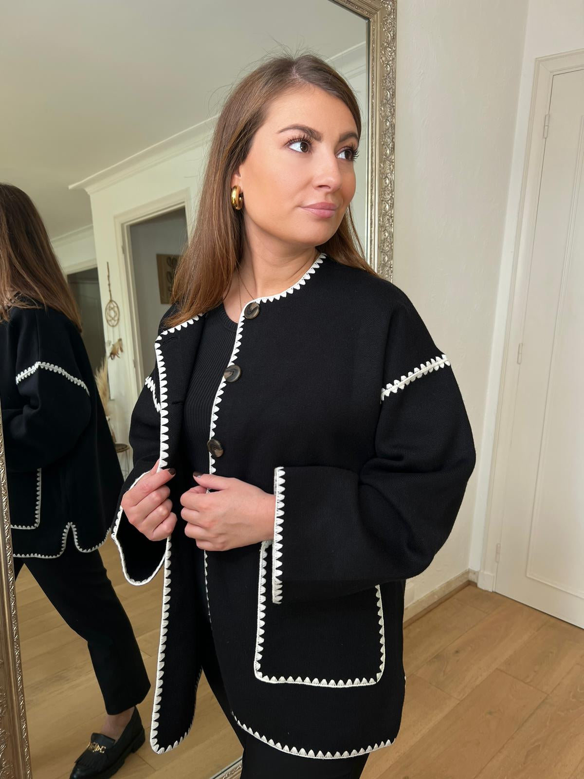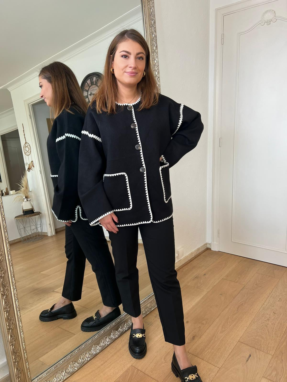 - On adore les bords des coutures crochetés au fil noir qui donnent toute l’élégance au gilet